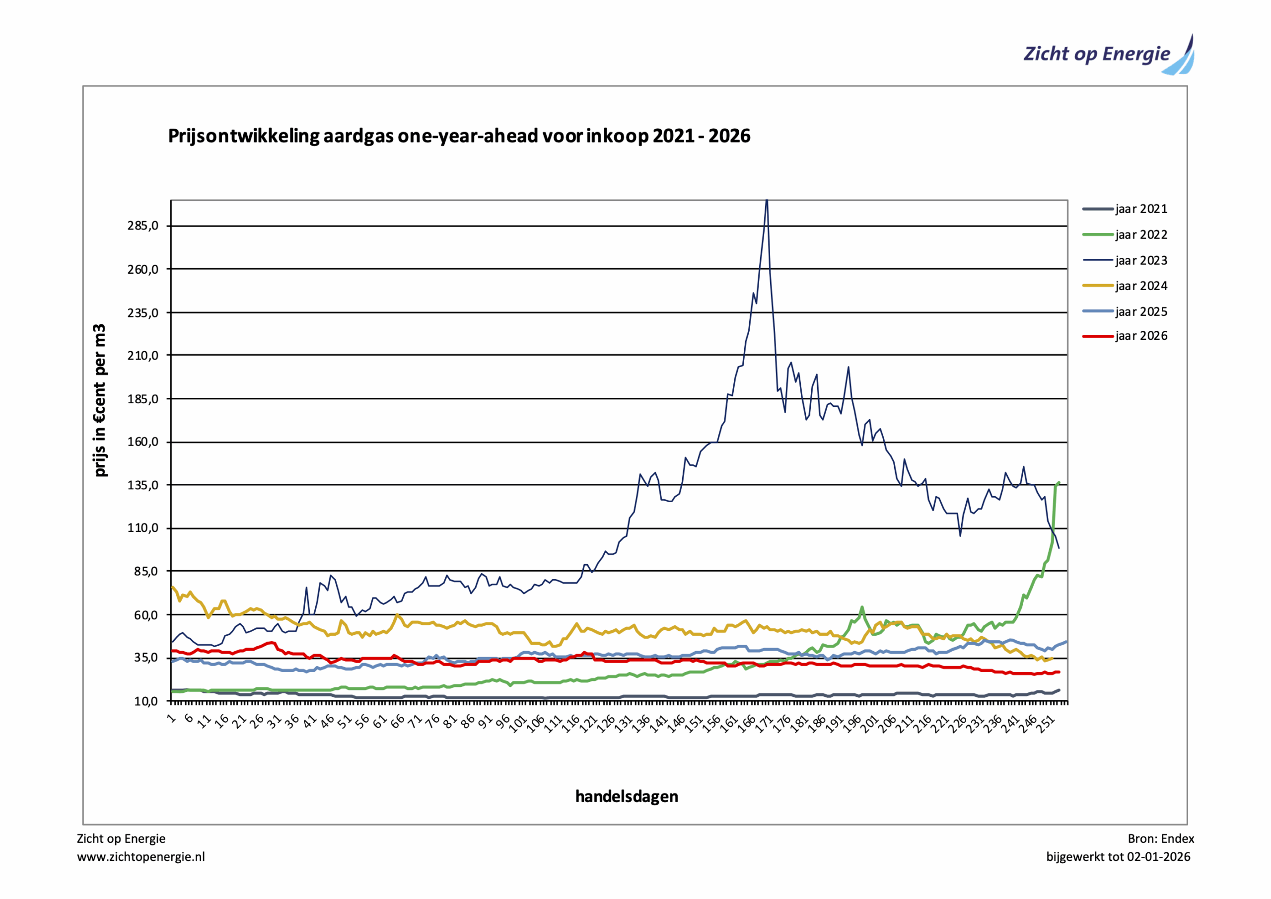 De grafiek Historische prijsontwikkelingen aardgas 2021-2026 toont de ontwikkelingen van de aardgasprijzen over een periode van vijf jaar. Tot het jaar 2021 waren de prijsvariaties onder de € 0,10 per m3 aardgas. In 2021 (voor het kalenderjaar 2022) zijn ineens extremere prijsbewegingen zichtbaar. Met name december 2021 en 2022 zijn prijzen hard gestegen. Daarna een gestage daling tot voorjaar 2024. Sindsdien lijkt de markt weer licht te stijgen.