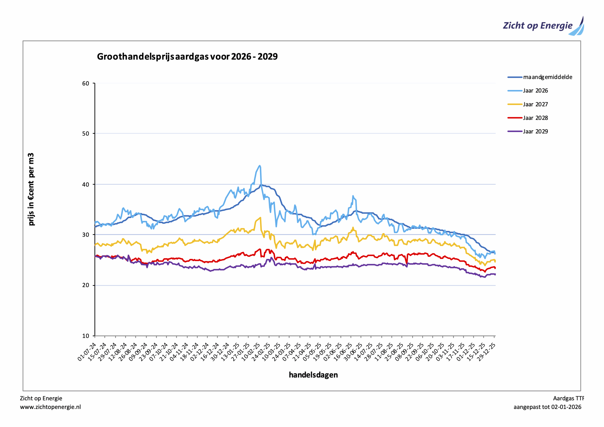 Onderstaande grafiek en tabel tonen de prijsontwikkeling van aardgas van 1 juli 2024 tot heden voor inkoop van de kalenderjaren 2026-2029. Het maandgemiddelde is het voortschrijdend gemiddelde van de laatste 20 handelsdagen.